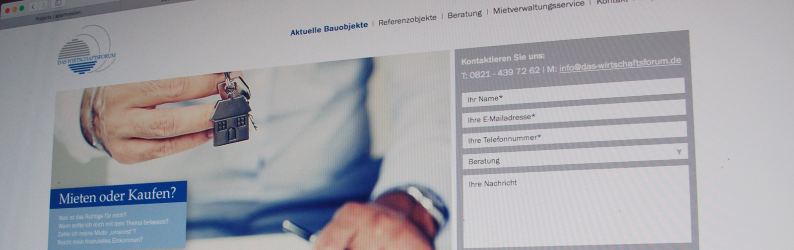 Im Jahr 2015 entwickelten wir für Das Wirtschaftsforum Kolednjak & Kollegen Augsburg auch die Firmenwebsite. Das CMS WordPress kommt zum Einsatz. Das Design sollte klar, übersichtlich und modern wirken, die Webseite zur Präsentation von Referenzobjekten und der Kundeninformation dienen, demnach sollte sie auch nicht überladen sein. Die Webseite verfügt über eine Bildergalerie, einen Sliderbanner sowie ein Kontaktformular mit costumer form elements.