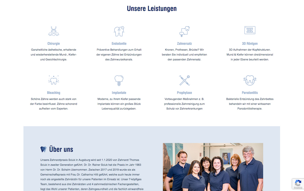 Zu unseren Aufgaben zählte die Neugestaltung des Logos, der kompletten Geschäftsausstattung, Patientenunterlagen sowie der Webseite. Herr Sciuk wollte einen geradlinigen, modernen Auftritt, der Qualität, Seriosität und Vertrauen vermitteln sollte. Für das Logo designten wir einen modernen, kantigen Zahn, der aus zwei Farben besteht – dazu passende eine sehr präsente, geradlinie Schriftart. Die Farbwahl für sämtliche Werbemittel viel auf zwei verschiedenen Blautöne, außerdem wurde darauf geachtete, dass überall ausreichend Weißfläche eingesetzt wurde. Die Webseite wurde schlicht als einfacher, aber sehr professioneller One-Pager mittels CMS WordPress umgesetzt. Die Homepage soll zu Informations- und Repräsentationszwecken für Patienten und Geschäftspartner dienen. Neben Logo, Visitenkarten, Anamnesebogen und Visitenkarten, gestalteten wir auch die Praxisschilder, T-Shirts der Angestellten und weitere Printmaterialien. Nachfolgend einige Eindrücke der gestalteten Marketingunterlagen: